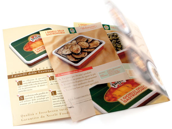 Ad un folder a tre ante è affidata la spiegazione di caratteristiche e vantaggi della rinnovata linea di prodotti. Contiene delle schede, ciascuna dedicata ad una specifica specialità alimentare, accanto alle dettagliate informazioni tecniche, si trovano anche contenuti extra, come ad esempio i suggerimenti dello chef per la realizzazione di ricette innovative.