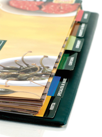 Raccoglitore ad anelli con schede dedicate ad ogni prodotto suddivise per famiglie merceologiche.