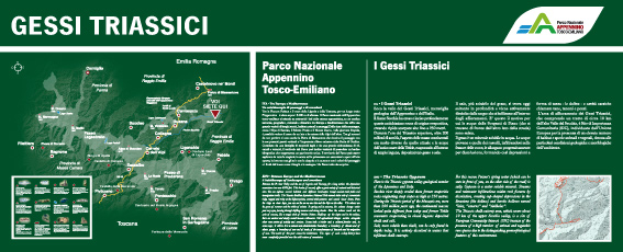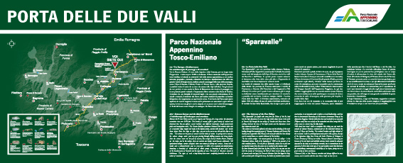 La grafica dei pannelli mette in evidenza attraverso l'uso di toni in contrasto i punti di interesse turistico del paesaggio, le informazioni specifiche sono approfondite nel riquadro delle icone e quelle generali nella zona di testo posta sulla destra.