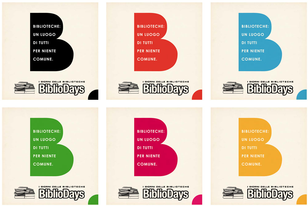 L’idea portante, semplice ed incisiva, è quella di utilizzare la “B” di biblioteca quale forma protagonista di un design che richiami lo stile della carta stampata e gli elementi della tradizione editoriale. Il logo così concepito, viene declinato in 6 differenti cromie per le applicazioni pratiche che illustreremo. Il pay off, inscritto all’interno del logo, contiene e fonde insieme, nello spazio di 8 parole, i concetti di “accoglienza”, “bene comune” e biblioteca come luogo sorprendente da scoprire.